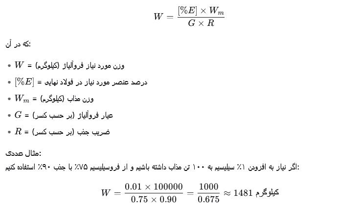 یک اشتباه رایج در واحدهای تولیدی این است که اپراتور کوره صرفاً بر اساس عیار، مقدار فروآلیاژ مورد نیاز را محاسبه میکند. فرمول صحیح به صورت زیر است: